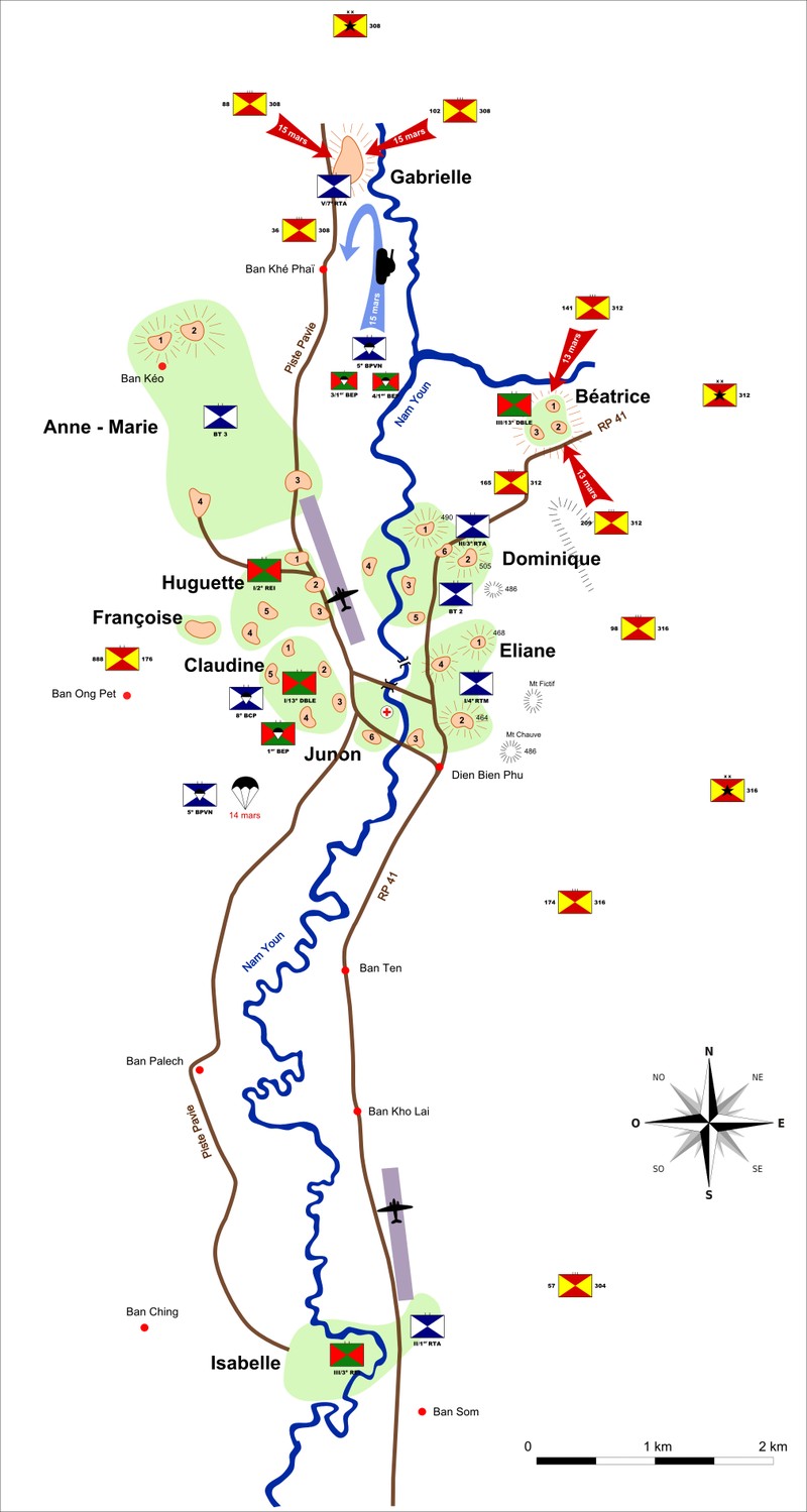 Sau một thời gian chuẩn bị, lực lượng quân Pháp đồn trú tại Điện Biên Phủ (kể cả sau khi tăng viện) đã tăng lên tới 16.200 quân, bao gồm 16 tiểu đoàn, 9 đại đội bộ binh và lính nhảy dù, gần 3 tiểu đoàn pháo binh 105 ly và 1 đại đội pháo 155 ly, 2 đại đội súng cối 120 ly, 1 tiểu đoàn công binh, 1 đại đội xe tăng 18 tấn, 1 trung đoàn xe vận tải 200 chiếc, 1 phi đội máy bay gồm 14 chiếc.