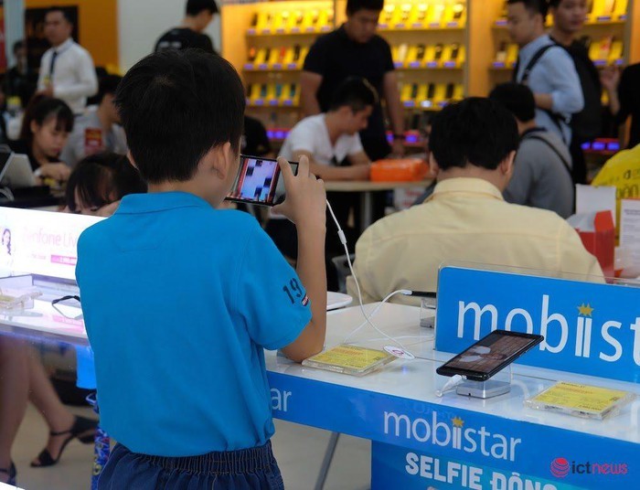 Một cậu bé đang chơi game ở quầy trưng bày điện thoại Mobiistar tại siêu thị điện thoại. Ảnh: Hải Đăng