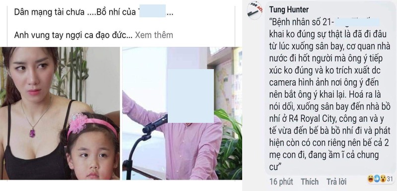 Từ tối 11 tháng 3, gần một chục tài khoản trên Facebook đã đăng tải thông tin rằng bệnh nhân số 21 N.Q.T sau khi đi công tác nước ngoài về đã đến nhà bồ nhí với con riêng ở tòa R4 Royal City khiến cho hai mẹ con cô này bị “bế đi cách ly”, khiến cả chung cư ầm ĩ. Hình ảnh mà các tài khoản Facebook này đưa lên là diễn viên Mỹ Linh và bé Moon.
