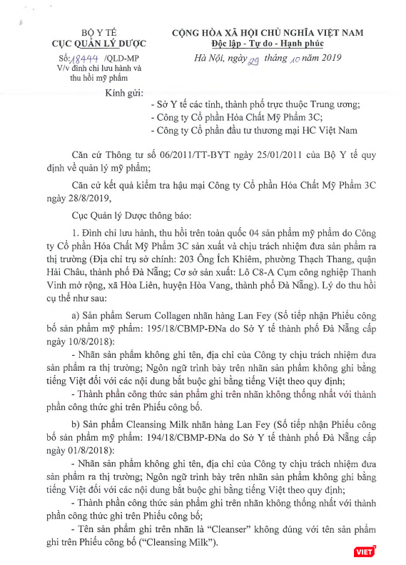 Cục Quản lý Dược đề nghị Công ty Cổ phẩn Hóa chất mỹ phẩm 3C và Công ty Cổ phần thương mại đầu tư thương mại HC Việt Nam phải gửi thông báo thu hồi tới những nơi phân phối, sử dụng các sản phẩm do Công ty đứng tên công bố, đồng thời, thu hồi toàn bộ sản phẩm mỹ phẩm không đáp ứng quy định.