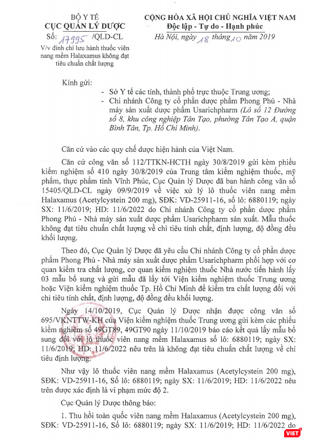 Căn cứ vào quy chế dược hiện hành và phiếu kiểm nghiệm của Trung tâm kiểm nghiệm thuốc, mỹ phẩm, thực phẩm tỉnh Vĩnh Phúc, Cục Quản lý Dược đã quyết định xử lý lô thuốc viên nang mềm Halaxamus (Acetylcystein 200 mg), SĐK: VD-25911-16, số lô: 6880119; NSX: 11/6/2019; HSD: 11/6/2022 do chi nhánh Công ty cổ phần Dược phẩm Phong Phú – Nhà máy sản xuất dược phẩm Usarichpharm sản xuất.