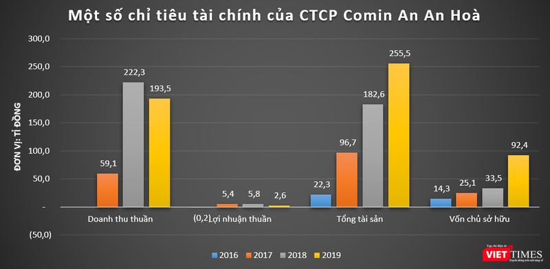 Cụ thể, năm 2017, công ty này ghi nhận doanh thu 59,1 tỉ đồng, báo lãi 5,36 tỉ đồng. Tới năm 2018, doanh thu của Comin An An Hoà tăng 3,7 lần năm trước, báo lãi 5,78 tỉ đồng. Trong năm 2019, doanh thu của công ty giảm nhẹ xuống còn 193,5 tỉ đồng, báo lãi 2,59 tỉ đồng (bằng một nửa so với năm 2018). Tính đến ngày 31/12/2019, quy mô tổng tài sản của Comin An An Hoà ở mức 255,5 tỉ đồng, cao gấp 2,7 lần vốn chủ sở hữu.