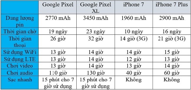 PhoneArena đã thử làm một bài so sánh nhỏ về thời lượng dùng pin của Google Pixel và Pixel XL với iPhone 7, iPhone 7 Plus – 2 chiếc điện thoại mới nhất của Apple. Tất nhiên, thông số mà PhoneArena dùng để so sánh là do Google và Apple cung cấp. Mỗi công ty sẽ có tiêu chí đo thời lượng dụng pin riêng nên kết quả dưới đây chỉ mang tính chất tương đối.