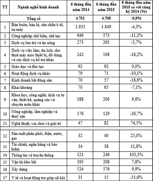 Số doanh nghiệp gặp khó khăn buộc phải tạm ngừng hoạt động trong 6 tháng đầu năm là 27.051 doanh nghiệp, giảm 5,8% so với cùng kỳ năm trước, bao gồm 8.898 doanh nghiệp đăng ký tạm ngừng hoạt động có thời hạn và 18.153 doanh nghiệp ngừng hoạt động chờ đóng mã số doanh nghiệp hoặc không đăng ký. Số doanh nghiệp ngừng hoạt động quay trở lại hoạt động trong 6 tháng là 8.507 doanh nghiệp, tăng 2,2% so với cùng kỳ năm 2014.