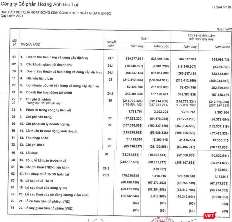 Trên bảng cân đối, tại ngày 31/3/2021, quy mô tổng tài sản của HAGL đạt 18.416 tỉ đồng, giảm 50,5% so với đầu năm. Trong đó, chiếm tỷ trọng lớn là phải thu về cho vay ngắn hạn (5.157,3 tỉ đồng), phải thu về cho vay ngắn hạn (4.037,9 tỉ đồng); số dư tiền và tương đương tiền tăng 2,8 lần lên đạt 272,5 tỉ đồng.Lũy kế 3 tháng đầu năm 2021, nhờ được hoãn lại hơn 179,3 tỉ đồng thuế thu nhập doanh nghiệp nên HAGL báo lỗ ròng 68,7 tỉ đồng, thay vì lỗ hơn 248 tỉ đồng trước thuế. Lỗ sau thuế của công ty mẹ là 58,4 tỉ đồng. Khoản lỗ này khiến lỗ luỹ kế chưa phân phối của HAGL tại ngày 31/3/2021 tăng lên mức 7.474 tỉ đồng.