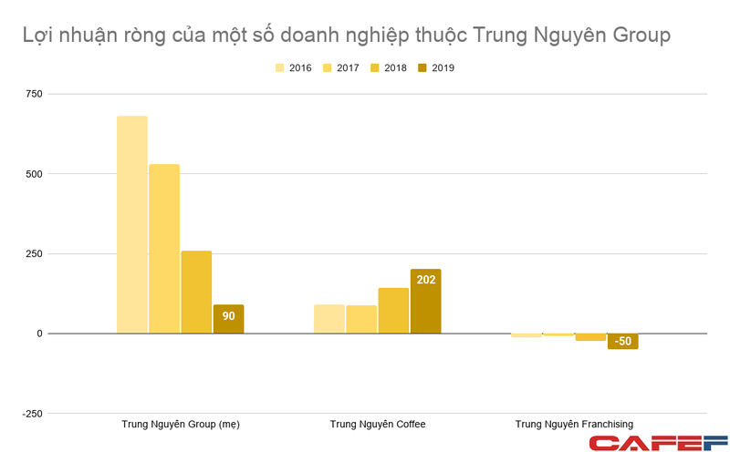 Một đơn vị khác trong hệ sinh thái Tập đoàn cũng minh chứng rõ cho hiện thực này. Công ty Trung Nguyên Franchising điều hành chuỗi cà phê Trung Nguyên Legend và Trung Nguyên E-Coffee dù ghi nhận doanh thu tăng, nhưng lỗ cũng ngày càng nặng. Mức lỗ trong 2019 hơn 50 tỷ đồng, gấp đôi so với năm trước đó. Cả hệ thống đem về doanh thu 410 tỷ đồng, đã thua xa các chuỗi cà phê top đầu như Highlands, The Coffee House, Starbucks, hay Phúc Long...