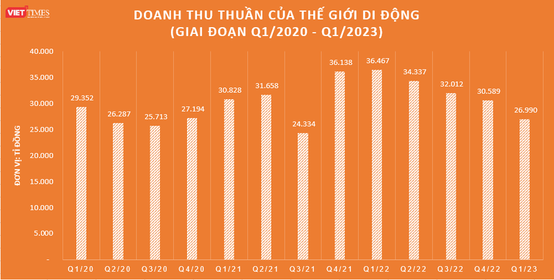 CTCP Đầu tư Thế giới di động (Mã CK: MWG) vừa công bố kết quả kinh doanh quý 1/2023 với doanh thu thuần giảm 26% so với cùng kỳ, đạt 26.990 tỉ đồng, qua đó hoàn thành 20% chỉ tiêu doanh thu đề ra cho cả năm (135.000 tỉ đồng).
