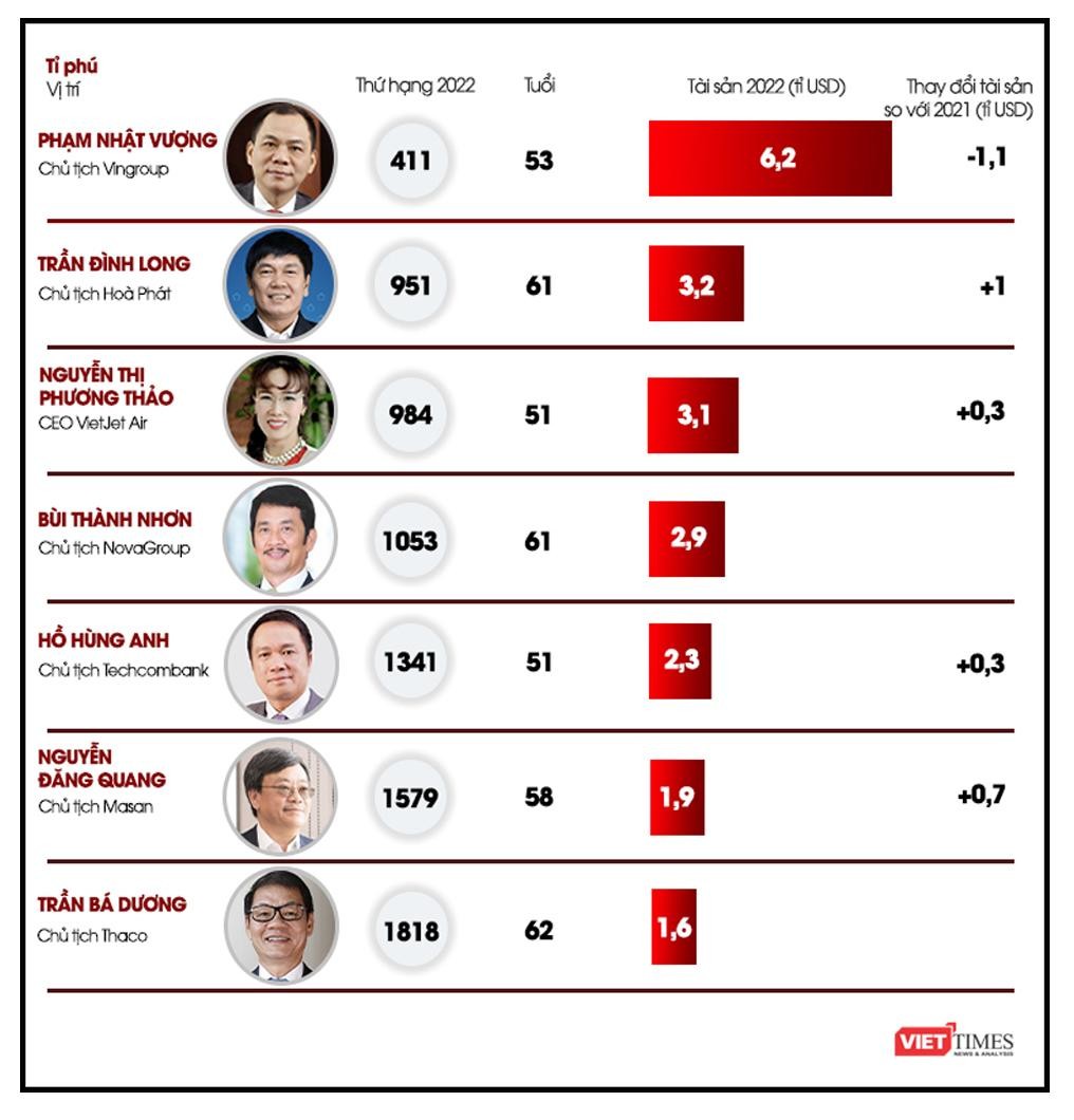 Đầu tháng 4 vừa rồi, Forbes cập nhật danh sách tỉ phú thế giới năm 2022. Việt Nam đóng góp 7 cái tên. Đó là Chủ tịch Vingroup Phạm Nhật Vượng, CEO VietJet Air Nguyễn Thị Phương Thảo, Chủ tịch Hòa Phát Trần Đình Long, Chủ tịch Techcombank Hồ Hùng Anh, Chủ tịch Thaco Trần Bá Dương, Chủ tịch Masan Nguyễn Đăng Quang và Chủ tịch Nova Group Bùi Thành Nhơn.