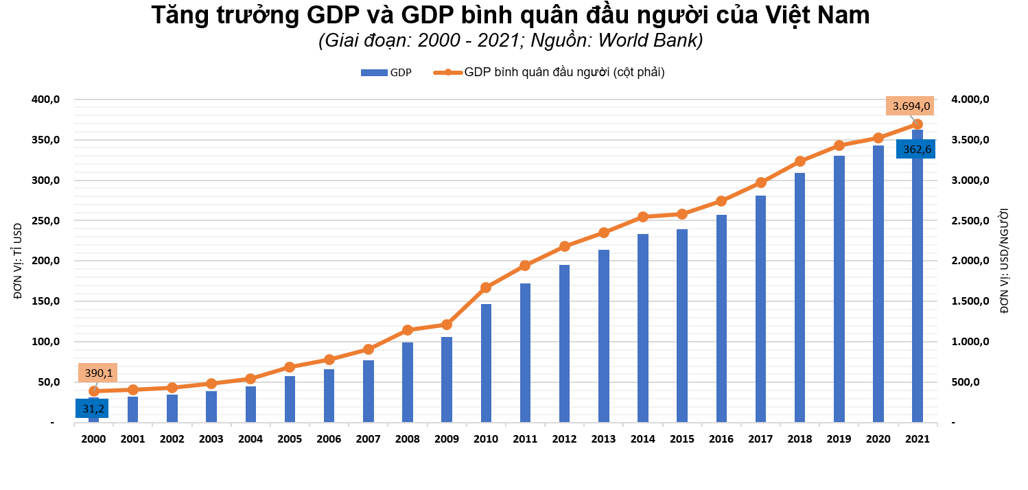 Thu nhập bình quân đầu người Việt Nam cũng được cải thiện mạnh từ mức 2.178 USD/người của 2012 lên mức 3.694 USD/người của năm 2021.