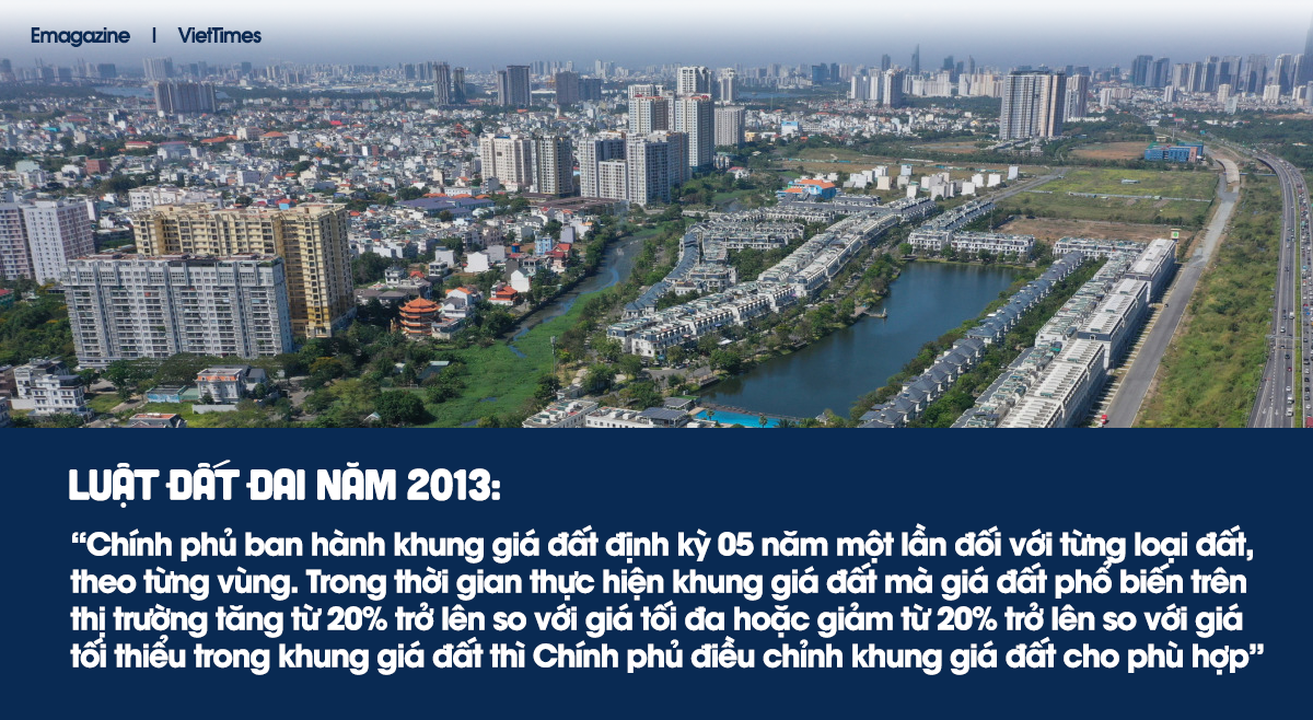 Luật Đất đai năm 2013 cụ thể hơn nhưng vẫn bám theo nguyên tắc trên: “Chính phủ ban hành khung giá đất định kỳ 05 năm một lần đối với từng loại đất, theo từng vùng. Trong thời gian thực hiện khung giá đất mà giá đất phổ biến trên thị trường tăng từ 20% trở lên so với giá tối đa hoặc giảm từ 20% trở lên so với giá tối thiểu trong khung giá đất thì Chính phủ điều chỉnh khung giá đất cho phù hợp”; “Căn cứ nguyên tắc, phương pháp định giá đất và khung giá đất, UBND cấp tỉnh xây dựng và trình HĐND cùng cấp thông qua bảng giá đất trước khi ban hành...” (Bổ sung quy định điều chỉnh khung giá đất).