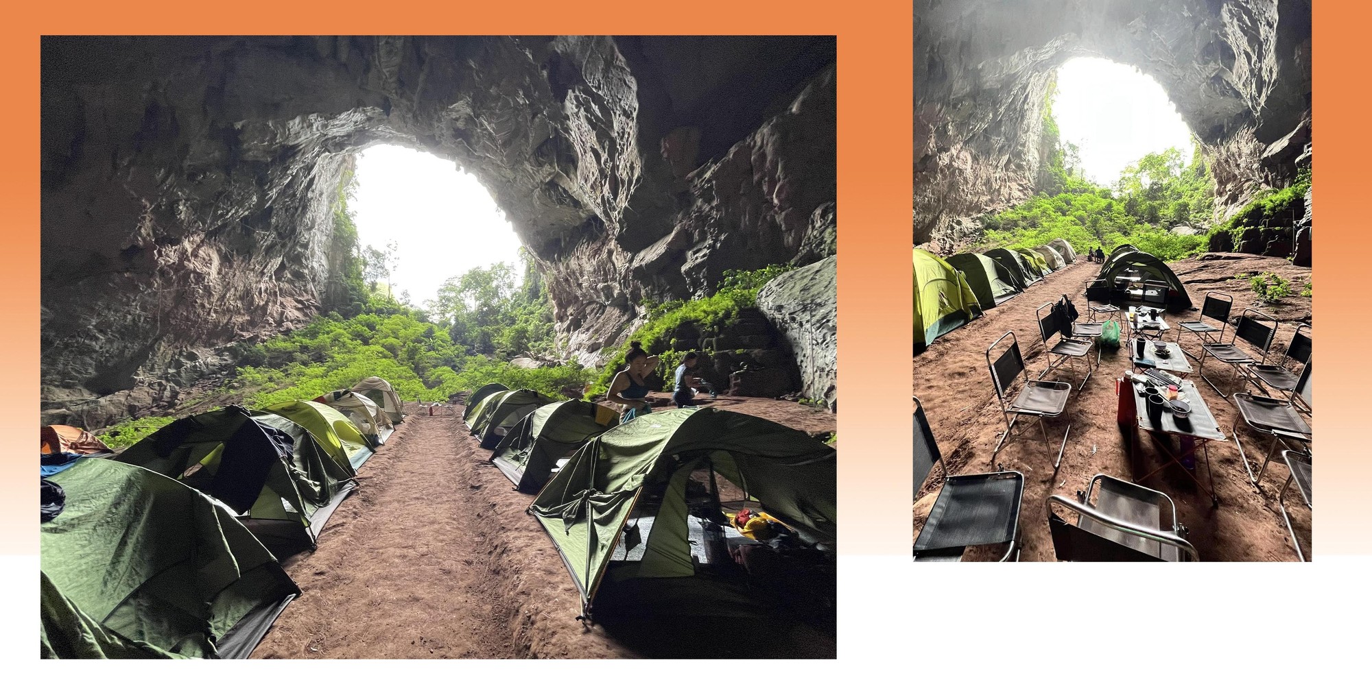 Khu cắm trại nằm trên 1 bãi đất trống. Ngay bên dưới, có con suối chảy ngầm trong hang nơi mà chúng tôi phải mặc áo phao, đội mũ bảo hiểm có gắn đèn, đi dép quai hậu hoặc giày để được trải nghiệm bơi trong hang.
