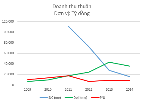 Trong 4 năm gần đây, doanh thu SJC liên tục sụt giảm từ mức 111 nghìn tỷ đồng năm 2011 thì đến năm 2014 chỉ còn hơn 16 nghìn tỷ đồng bởi ảnh hưởng từ thị trường vàng miếng.