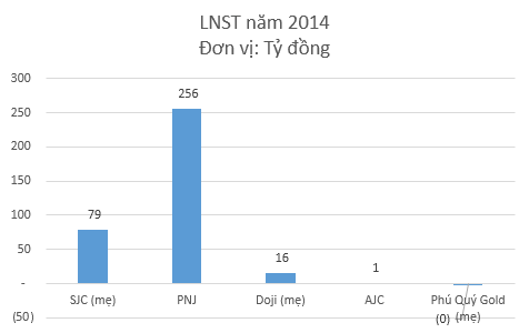 Năm 2014, doanh thu PNJ dù đạt khá thấp so với các đối thủ như SJC hay DOJI nhưng lại là doanh nghiệp có lợi nhuận cao nhất toàn ngành với 256 tỷ đồng.