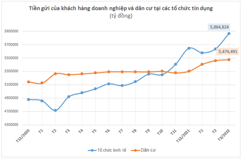 Trong đó, tiền gửi của dân cư đạt hơn 5,47 triệu tỷ đồng, tăng gần 174.000 tỷ trong 3 tháng đầu năm, tương đương tăng 3,28%. Mức tăng này lớn hơn cả tăng trưởng đạt được trong năm 2021 (chỉ hơn 158.000 tỷ đồng). Ngoài ra, đáng chú ý, tiền gửi dân cư tăng trưởng dương cả trong 3 tháng đầu năm trong khi cùng kỳ các năm trước sẽ sụt giảm 1-2 tháng do yếu tố mùa vụ Tết Nguyên Đán.