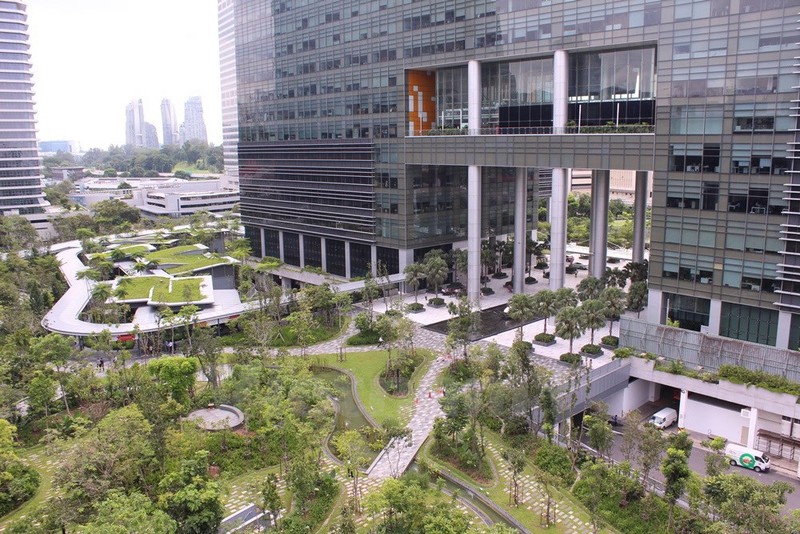 Lối vào văn phòng Google nhìn từ trên cao cho thấy cây xanh được phủ kín tạo cảm giác như lọt thỏm vào một khu rừng mà xuyên suốt là những lối đi được thiết kế đẹp mắt dẫn dắt vào