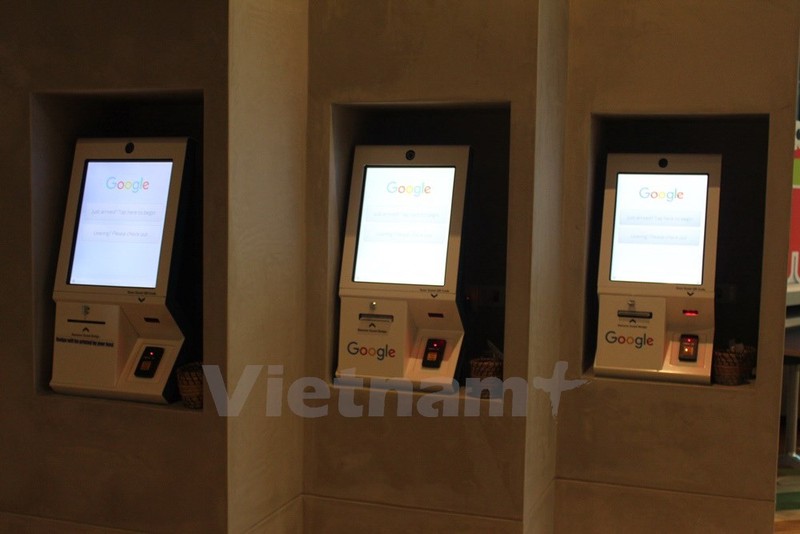 Các máy tự động dành cho khách đến đăng ký tham quan khu văn phòng Google được trang bị ngay khu vực sảnh đón tiếp. (Ảnh: Mỹ Bình/Vietnam+)