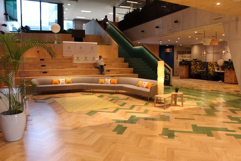 Sảnh rộng với những bậc thang được thiết kế rộng và gam màu ấm để mọi người có thể thoải mái ngồi làm việc hay thư giãn... (Ảnh: Mỹ Bình/Vietnam+)