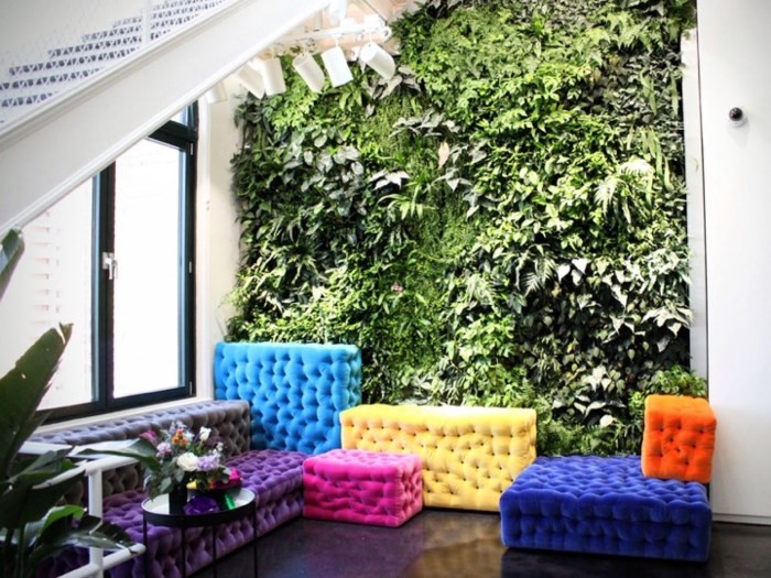 Ở góc văn phòng là bức tường phủ xanh trải dài đến 2 tầng, nhiều ghế ngồi đầy màu sắc để nằm nghỉ