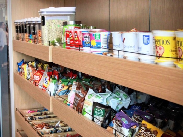 Nhà bếp của Instagram có đầy đủ thực phẩm gồm cà phê, trà, tủ lạnh chứa nước ép, bắp rang và nước uống hiệu Gatorade