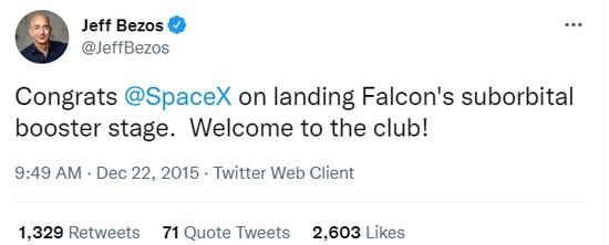 Cuối năm 2015, SpaceX đã lần đầu tiên hoàn thành việc thu hồi tên lửa Falcon 9. Bezos đã gửi dòng tweet như một lời chúc mừng: