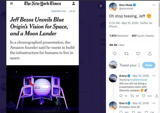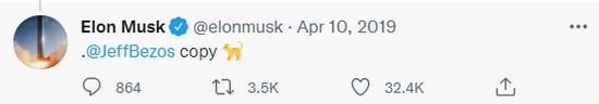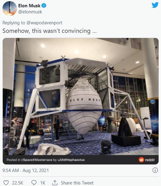 Đáp trả lại hành động của Jeff Bezos, Elon Musk đã tweet về một bức ảnh chụp Blue Moon với chú thích: "Đằng nào thì cái này (Blue Moon) vẫn không thuyết phục…"