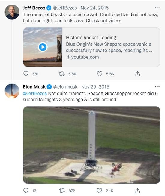 Cuộc tranh cãi giữa hai nhà sáng lập cũng trở nên rõ ràng. Khi Bezos đăng video ca ngợi Blue Origin sau khi công ty này hạ cánh thành công tên lửa New Shepard năm 2015, ngay lập tức, Musk khẳng định SpaceX đã làm được điều đó từ ba năm trước.