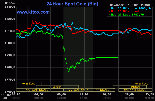 Kết phiên giao dịch cuối tuần, giá vàng giao ngay trên Kitco.com được giao dịch ở mức 1.787 USD/ounce, giảm khoảng 20 USD/ounce so với giá đóng cửa phiên liền trước. Giá vàng giao tháng 12/2021 trên sàn Comex New York cũng giảm xuống mức 1.804 USD/ounce.