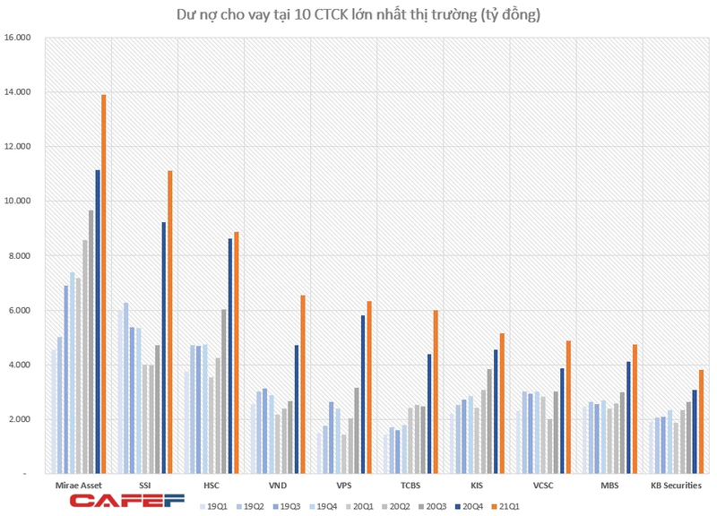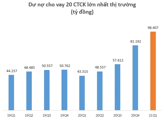 Tính riêng 20 CTCK lớn nhất thị trường có dư nợ cho vay cuối quý 1/2021 lên tới 98.407 tỷ đồng, tăng khoảng 17.200 tỷ ( 41%) so với quý 4/2020 và tăng 127% so với thời điểm thị trường tạo đáy tại vùng 660 điểm vào cuối quý 1/2020.
