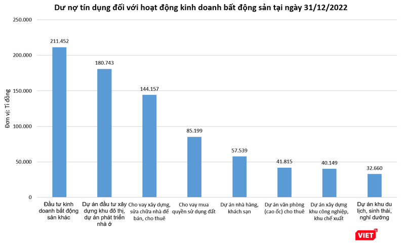 Cụ thể, trích dẫn số liệu của Ngân hàng Nhà nước Việt Nam (NHNN), báo cáo nhà ở và thị trường bất động sản quý IV năm 2022 và cả năm 2022 của Bộ Xây dựng cho biết, tính đến ngày 31/12/2022, dư nợ tín dụng đối với hoạt động kinh doanh bất động sản đạt khoảng 800.000 tỉ đồng.