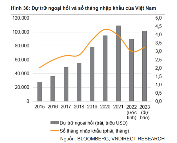 “Do đó, chúng tôi kỳ vọng dự trữ ngoại hối của Việt Nam sẽ phục hồi lên mức 3,3 tháng nhập khẩu và đạt 102 tỉ USD vào cuối năm 2023 từ mức hiện tại là 90 tỉ USD trong năm 2022”, VNDirect nhận định.