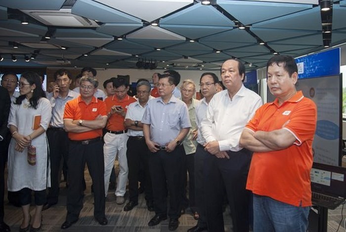 Bộ trưởng Chủ nhiệm Văn phòng Chính phủ Mai Tiến Dũng và các thành viên trong đoàn công tác nghe chia sẻ giải pháp Chính quyền điện tử tại Quảng Ninh (Ảnh FPT cung cấp)
