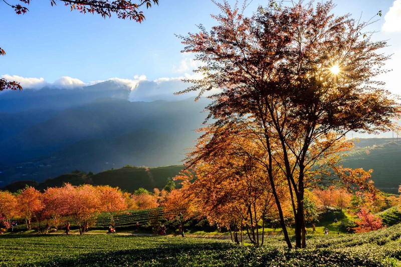 Thời điểm chụp ả Thời điểm chụp ảnh đẹp nhất đồi chè là khi sáng sớm, lúc mây còn bảng lảng chưa tan nhưng ánh nắng đã le lói đổ bóng qua những hàng cây. Hoa đào và hoa nắng lấp lánh xen kẽ, tạo nên khung cảnh đẹp mê hồn mà ai cũng sẽ một lần ao ước muốn được đặt chân tới.