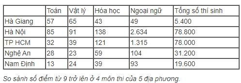 Đáng ra phải mừng cho thành tích thi cử vượt bậc của các học sinh tỉnh miền núi Hà Giang nhưng ngược lại. Không ai tin rằng, trong 78.032 học sinh TP. HCM chỉ có 32 bạn đạt điểm 9,10 môn Toán thì chỉ 5.433 học sinh của Hà Giang là có đến 57 điểm 9,10 môn thi này. Câu chuyện cũng không chỉ dừng lại ở môn Toán, các môn thi khác thì địa phương này đều vượt trội…một cách khó giải thích.