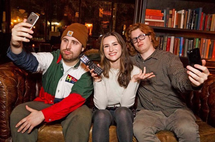 Mackenzie Bergin (ngồi giữa) đang dùng chiếc điện thoại nắp gập, trái ngược với những người bạn cùng lứa