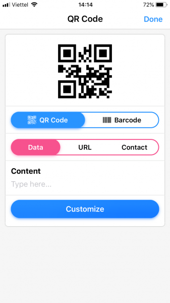 Với Barcode, bạn chỉ có thể tạo nội dung văn bản. Còn QR Code, bạn có ba lựa chọn nội dung tạo là: Data (văn bản, SMS, email hay nội dung tin nhắn,…), URL (link trang web) và Contact (thông tin liên lạc).