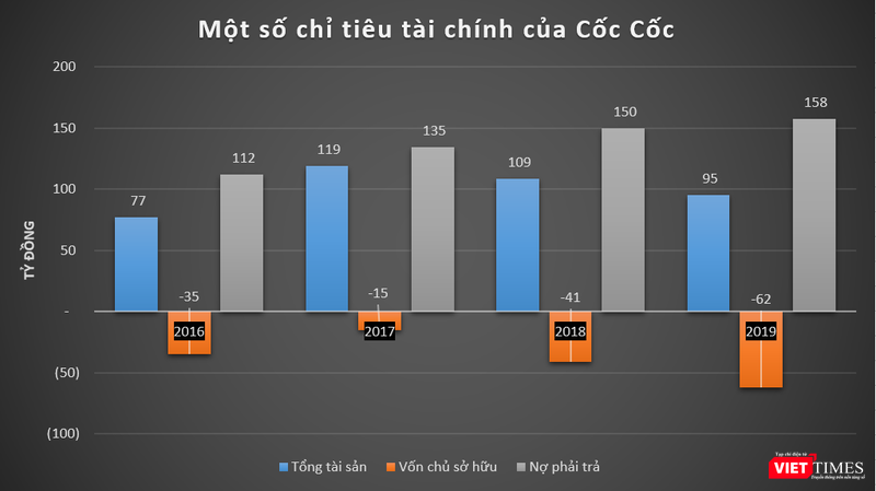 Tính đến cuối năm 2019, tổng tài sản của Cốc Cốc đạt 95,45 tỷ đồng, giảm 12% so với thời điểm đầu năm; vốn chủ sở hữu giảm thêm 21 tỷ đồng về mức âm 62,2 tỷ đồng.
