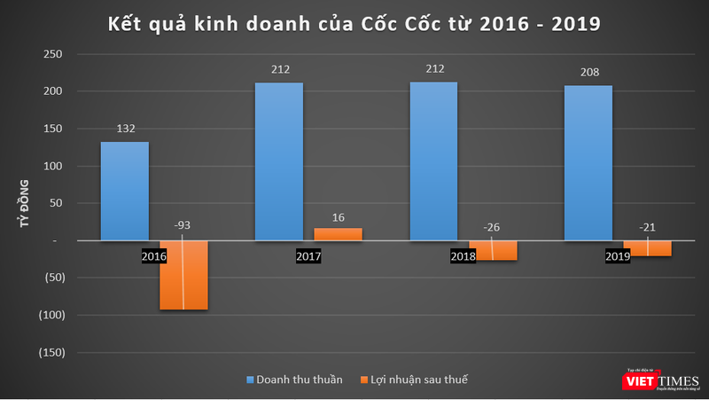 Cụ thể, trong năm 2017, Cốc Cốc báo lãi 16 tỷ đồng, trong khi các năm 2016, 2018 và 2019 báo lỗ lần lượt 93 tỷ đồng, 26 tỷ đồng và 21 tỷ đồng. Năm 2017 cũng là năm chứng kiến sự đột phá trong tăng trưởng doanh thu của Cốc Cốc với giá trị đạt 211,6 tỷ đồng, tăng gần 60% so với năm 2016.