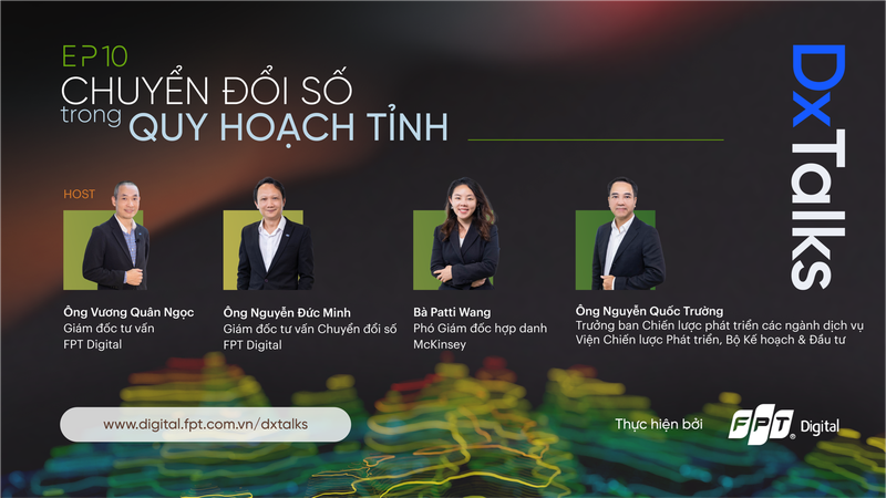 Với chủ đề "Chuyển đổi số trong Quy hoạch tỉnh", DxTalks tập 10 có sự tham gia của bà Patti Wang - Phó Giám đốc Hợp danh Công ty Tư vấn McKinsey; ông Nguyễn Quốc Trường - Trưởng ban Chiến lược Phát triển các ngành dịch vụ, Viện Chiến lược Phát triển thuộc Bộ Kế hoạch và Đầu tư; ông Nguyễn Đức Minh - Giám đốc Tư vấn Chuyển đổi số Công ty FPT Digital.