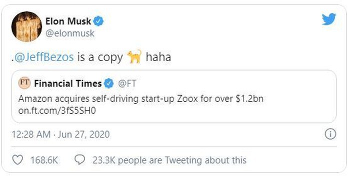 Elon Musk vừa công khai chế giễu Jeff Bezos trên Twitter hôm 27/6, chỉ một ngày sau khi Financial Times đưa tin Amazon mua lại startup taxi tự lái Zoox với giá 1,2 tỷ USD. Trong tweet, Musk gọi Bezos là “copycat” (kẻ bắt chước) nhưng dùng biểu tượng chú mèo màu vàng thay cho từ “cat”.