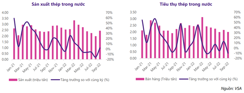 Dữ liệu từ Hiệp hội Thép Việt Nam (VSA) cho biết, sản xuất thép quý 3/2022 đạt 6,68 triệu tấn, giảm 7% so với cùng kỳ 2021, giảm 18% so với quý trước. Tiêu thụ thép đạt 6,14 triệu tấn, giảm 12% so với quý trước, giảm 1% so với quý 3/2021.