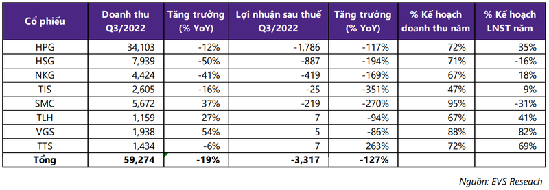 Hiện tại, hầu hết các doanh nghiệp ngành thép đã công bố báo cáo tài chính quý 3/2022. Theo đó, doanh thu và lợi nhuận của 8 doanh nghiệp thép lớn nhất đạt 59.274 tỉ đồng và âm 3.317 tỉ đồng, lần lượt giảm 19% và giảm 127% so với cùng kỳ năm trước.