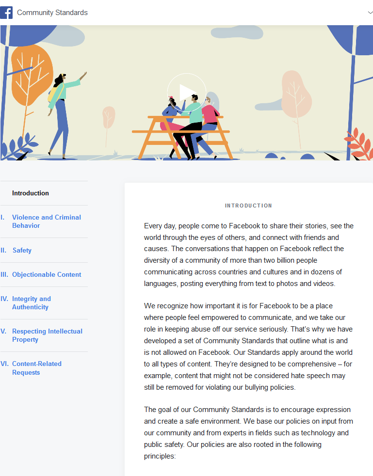 “Tiêu chuẩn cộng đồng” mới (xem tại đây) dài 8.500 chữ giải thích chi tiết về các nội dung bị cấm đăng tải như: Các nội dung bất hợp pháp, bạo lực, tình dục, gây tranh cãi với ngôn từ mang tính chất thù địch, đe dọa…