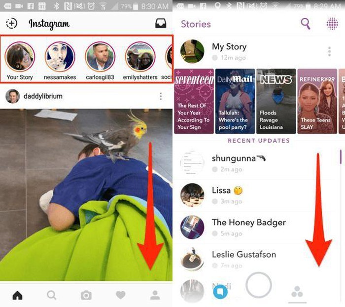 Giao diện "Stories" trên 2 ứng dụng Instagram (trái) và Snapchat (phải). Ảnh: Social Media Examiner.
