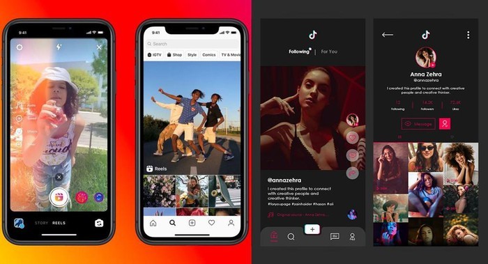 Reels (trái) là tính năng quay và chia sẻ video ngắn, ra mắt ngay sau khi Tổng thống Mỹ ban hành sắc lệnh cấm TikTok (phải). Ảnh: Chụp màn hình.