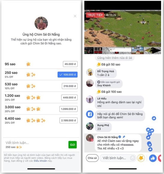 Facebook vừa mở tính năng cho phép những người theo dõi livestream có thể tặng sao cho game thủ tại Việt Nam. Cứ mỗi sao nhận được, streamer sẽ được trả 0,01USD. Việc người hâm mộ tặng tiền, thông qua sao hay hình thức khác, cho game thủ khi họ quay video trực tiếp không mới nhưng đây là lần đầu Facebook thực hiện.