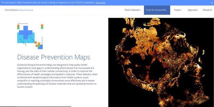 Ngày 6/4, Facebook cho biết chương trình "Data for Good" của mạng xã hội này đang phát triển Bản đồ phòng chống dịch bệnh ( Disease Prevention Maps), cho thấy các hoạt động dịch chuyển trong các khu vực trên thế giới. Facebook hy vọng dữ liệu này có thể được sử dụng cùng với các thông tin khác mà các cơ quan y tế công cộng thu thập để giúp xác định các khu vực có khả năng xảy ra bùng phát dịch COVID-19.