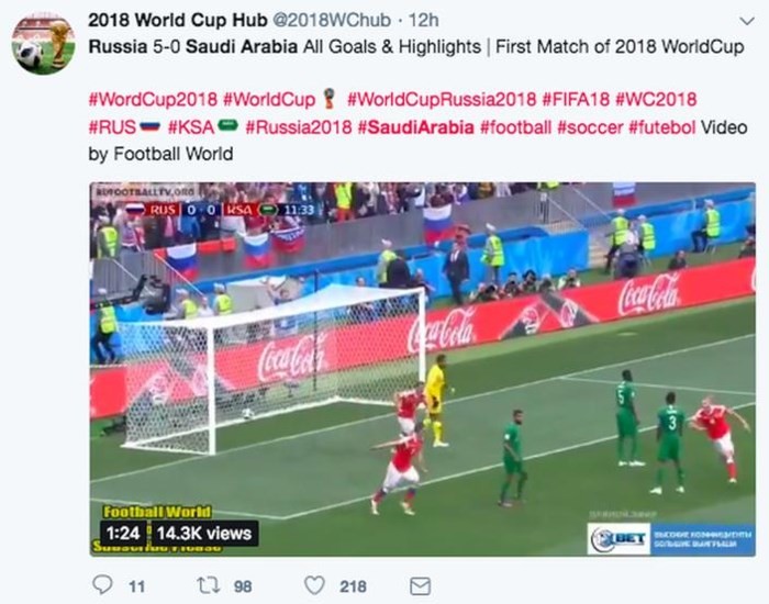 Thực tế, các nội dung lậu đã xuất hiện trực tuyến. Theo trang Recode, tìm kiếm "Russia Saudi Arabia" trên Twitter đã trả lại một số video nổi bật về các pha ghi bàn, do người dùng thông thường đăng lên, ngay từ trận mở màn. Trên Facebook, bạn có thể thấy toàn bộ các pha bóng nổi bật của các lần ghi bàn tạo nên chiến thắng 5-0 cho Nga trên các trang như "God55Sports" và "Away Goal".