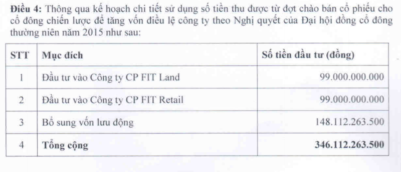 Nghị quyết này cũng thông qua kế hoạch chi tiết sử dụng số tiền thu được cho 3 mục đích: Đầu tư vào CTCP FIT Land (99 tỷ đồng); Đầu tư vào CTCP FIT Retail (99 tỷ đồng); Bổ sung vốn lưu động (148 tỷ đồng).