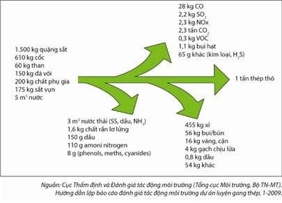 Cân bằng nguyên vật liệu và năng lượng để sản xuất ra 1 tấn thép thô từ nhà máy liên hợp gang thép như của Formosa mà Bộ TN-MT hướng dẫn (xem hình).