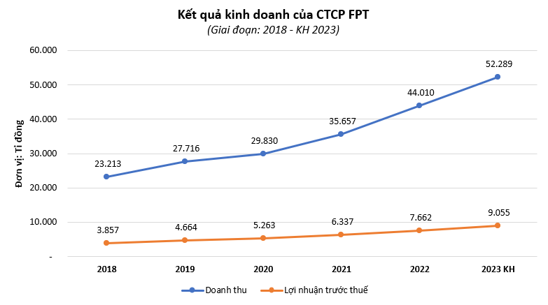 Theo đó, HĐQT FPT lên kế hoạch kinh doanh năm 2023 với tổng doanh thu đạt 52.289 tỉ đồng và lợi nhuận trước thuế 9.055 tỉ đồng, tăng trưởng lần lượt 18,8% và 18,2% so với thực hiện năm 2022.